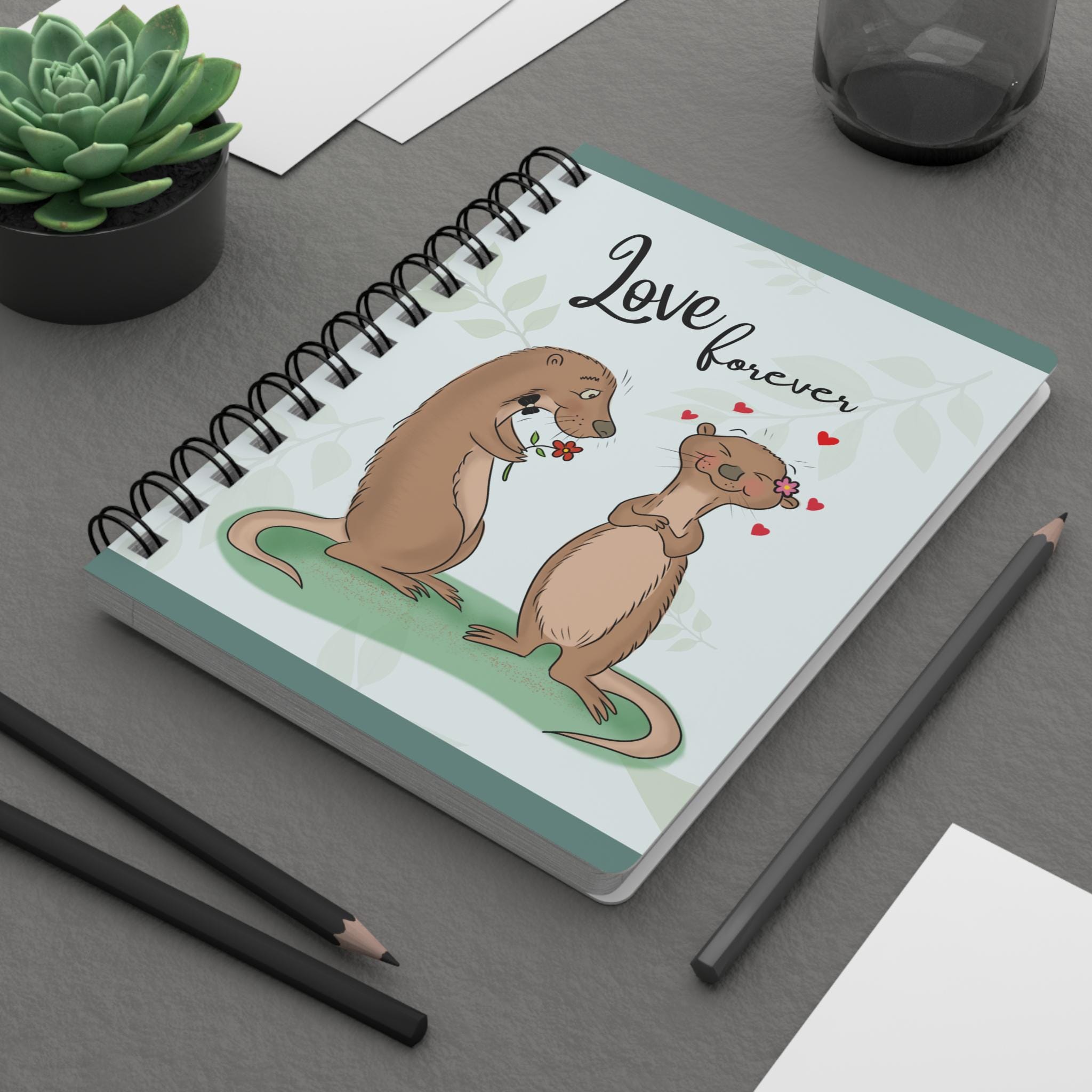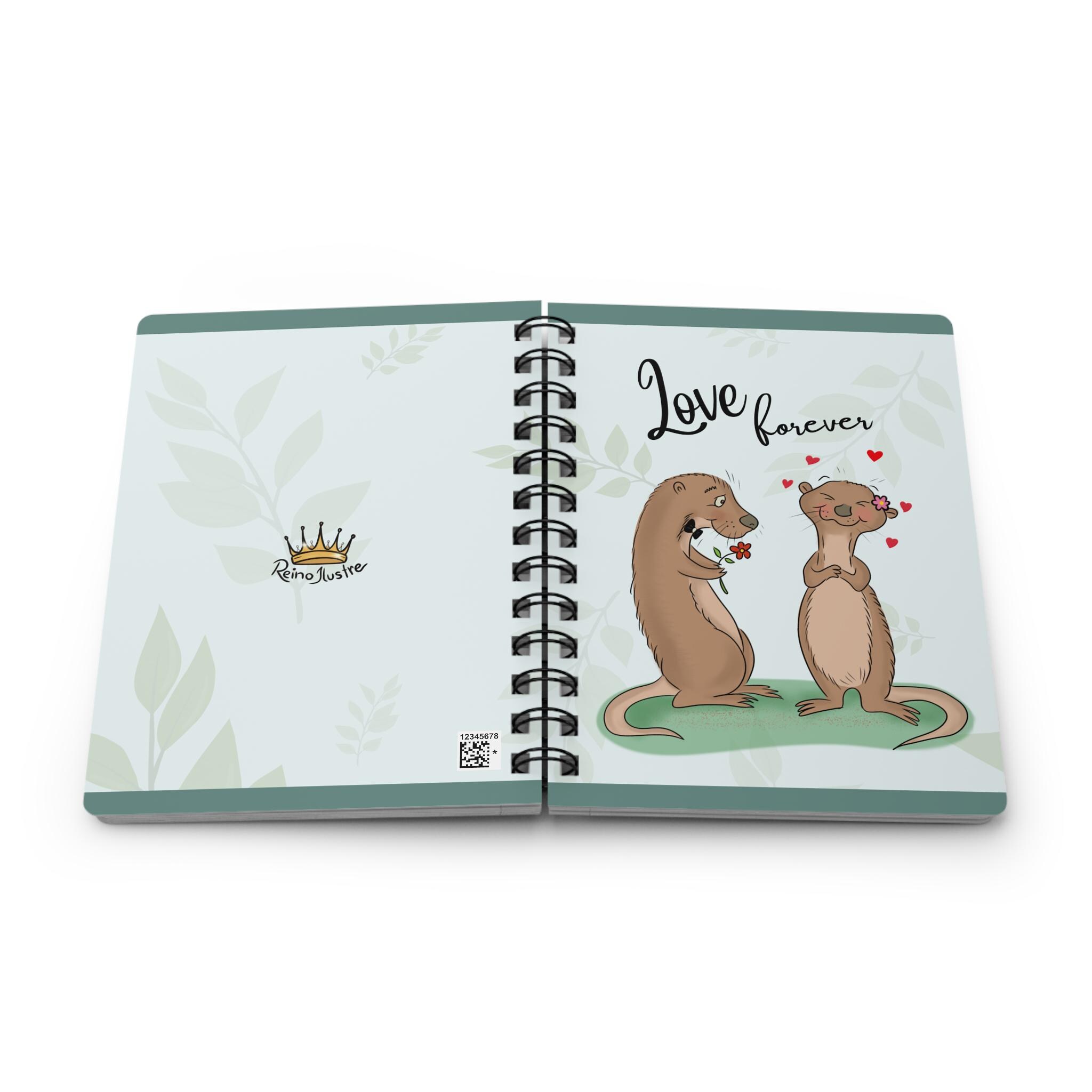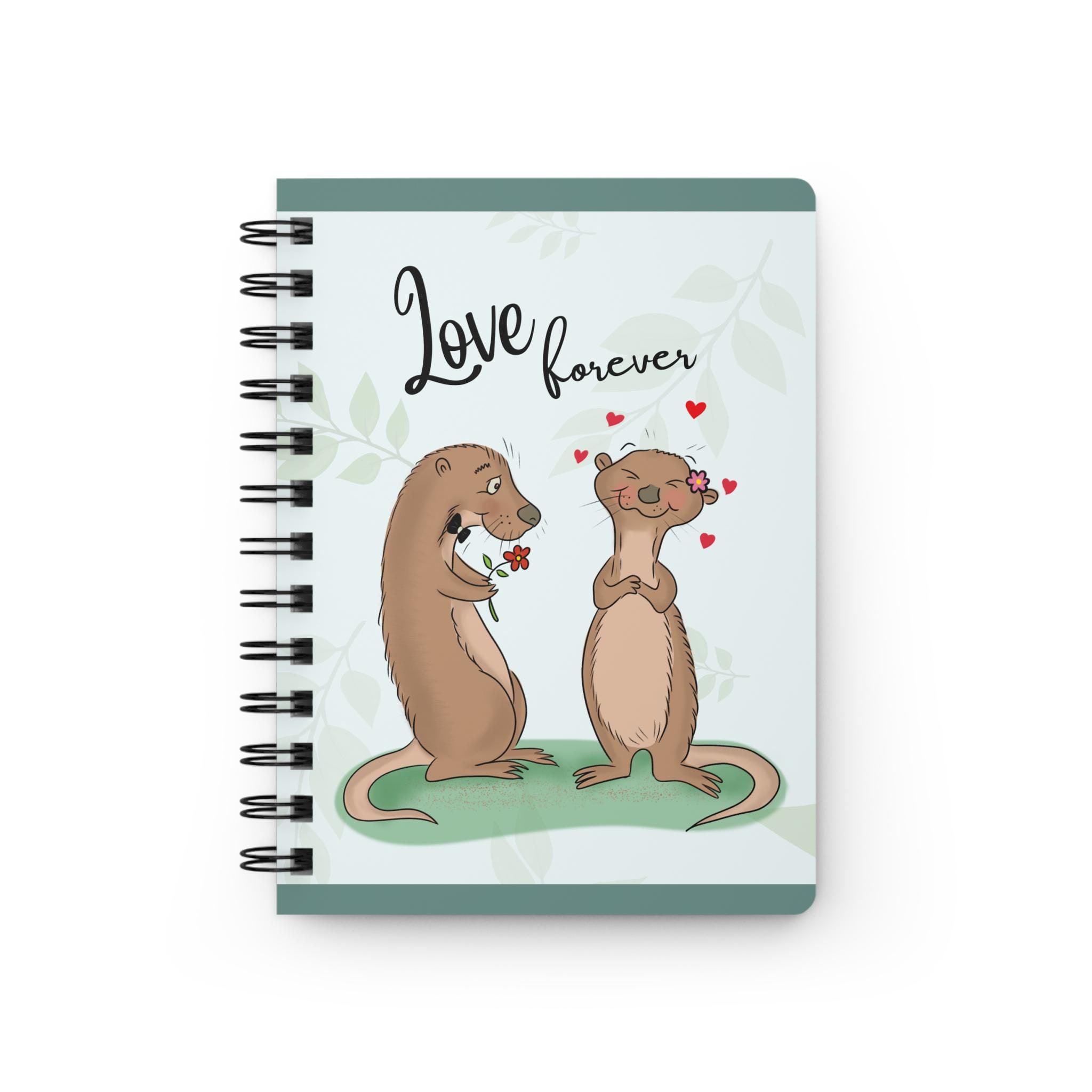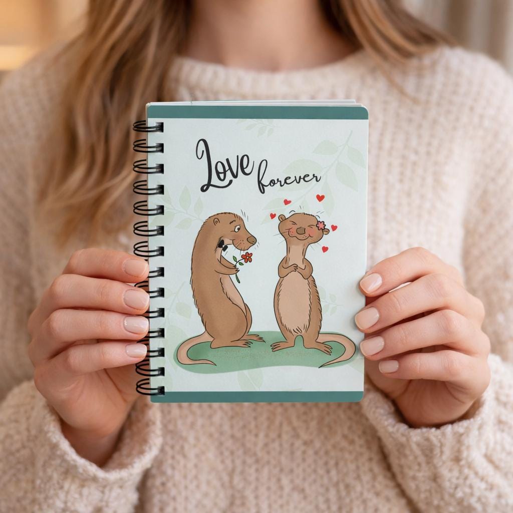 A sweet spiral-bound journal that carries a gentle, playful energy. Soft green foliage and a pair of adoring otters grace the glossy cover, with “Love forever” hand-lettered above them. Inside, 150 lined pages of smooth 90gsm paper invite daily notes, lists, sketches, or love letters. The metal spiral lets pages lie flat or be removed cleanly. Front, back and inner covers are fully printed for a cohesive look, and the durable glossy lamination keeps the cover bright and easy to wipe clean. Carry it to coffee dates, tuck it into a tote, or leave it on the bedside table as a tiny reminder of warmth and connection.